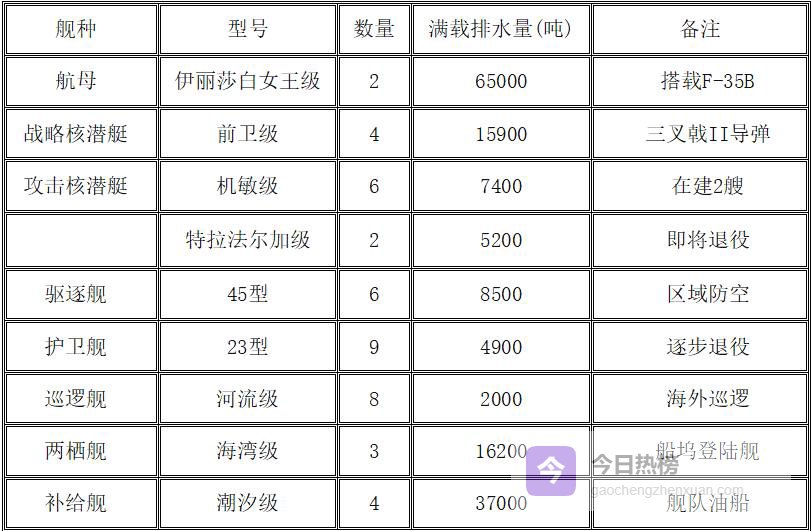 截至2025年,皇家海军总吨位50余万吨,在全球排名跌至第六。核心力量包括: