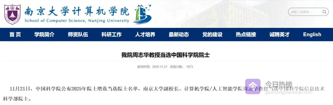 再看看副校长周志华, 他于2025年11月新晋为中科院院士, 在国内人工智能界是领军者, 这种全院士的领导班子加上信息技术人才的聚集, 这个意图再清楚不过, 南大正全力发展新工科。