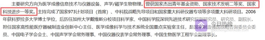 他的成绩很突出, 他带着团队造出中国首台3.0T高场磁共振, 直接挑战了GE、西门子、飞利浦的垄断地位, 之后又推出全球第一台5.0T超高场磁共振, 并让它走向市场, 2020年国家科技进步一等奖和国家技术发明二等奖的名单上, 都有他, 2023年11月他被选为中科院院士, 当时他才四十六岁, 在同批人里很年轻。