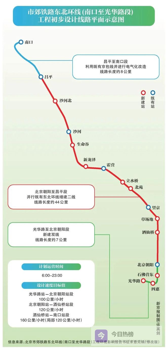 这个东北环线铁路是北京市与国铁集团联手打造的全国首条市郊铁路示范线,全长59公里,南起朝阳光华路(国贸CBD),北至昌平南口,设16座车站,其中10座可与地铁线换乘,预计2030年全线通车。