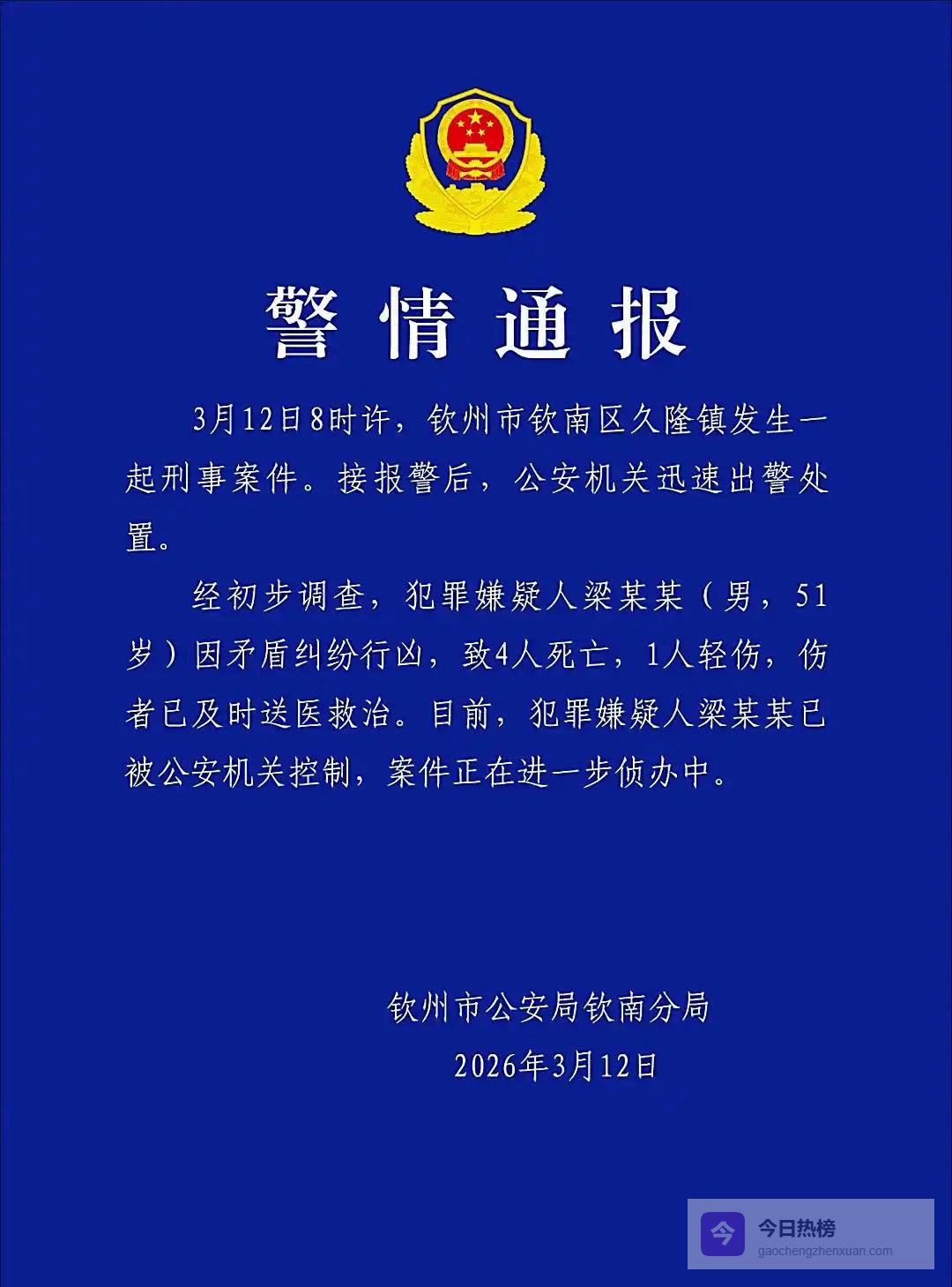 2026年3月12日8时许,广西钦州市钦南区久隆镇发生了一起重大刑事,导致4人死亡1人受轻伤,案发后警方迅速出警处置,51岁的犯罪嫌疑人梁某某已被控制,案件仍在进一步侦办中。