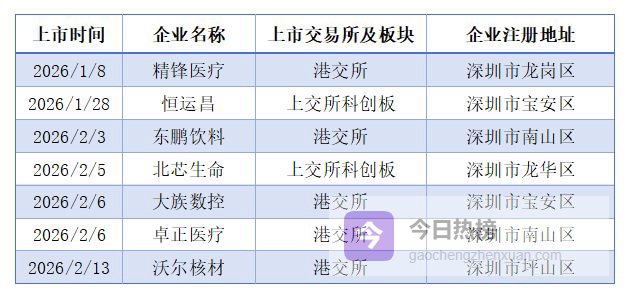 1—2月,广东省新增上市公司均来自深圳。据悉,当前深圳全面实行由市领导牵头负责的“一企一策一专班”包联机制,推动出台《深圳市推动优质企业上市融资工作方案(2026—2027年)》,细化各项工作目标举措,储备优质企业群体超2500家纳入上市梯度培育库,建立五级分层精准赋能机制,开展针对性梯度培育。