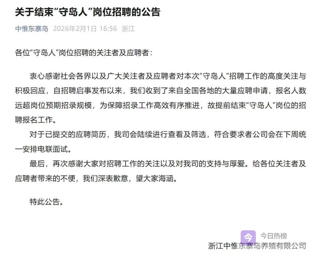 2月1日,浙江那边突然传来消息,说一家海岛养鱼的大黄鱼基地提前关掉了“守岛人”岗位的报名通道。原因超直白,报名人数远超预期,招的人又不多,怕弄得乱套,提前收官。有点让人摸不着头脑,但仔细想想,是真的太火了。