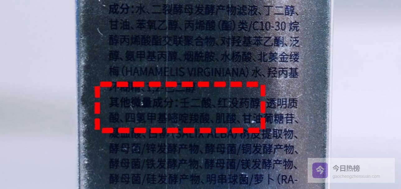 二是核心成分含量不符。产品背面成分表中,虽能找到水杨酸,但未标注任何具体含量,与宣传的“2%水杨酸”无法对应;而宣传中重点强调的“20%壬二酸”,仅出现在“其他微量成分”中,与宣传的高含量严重不符。