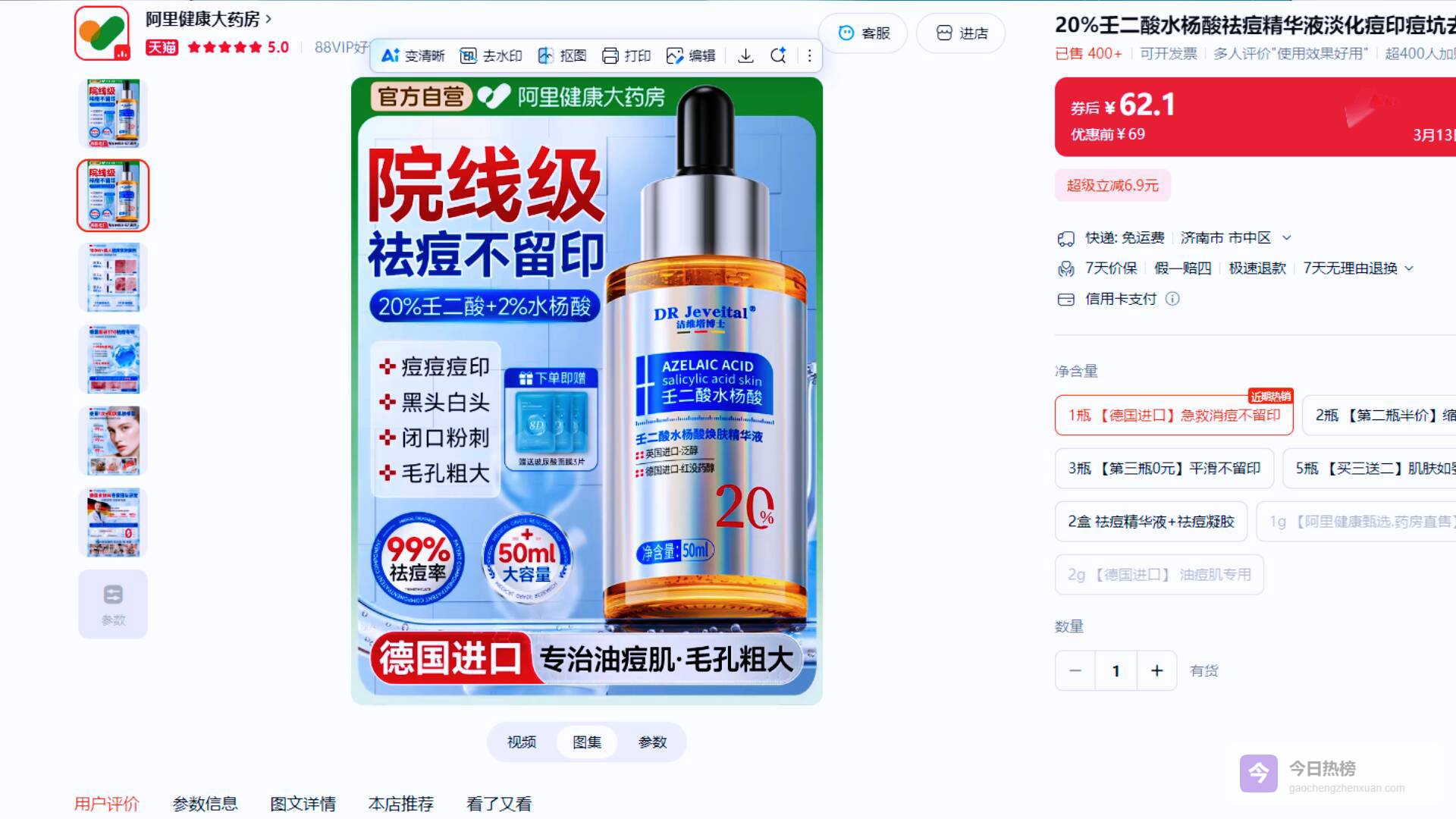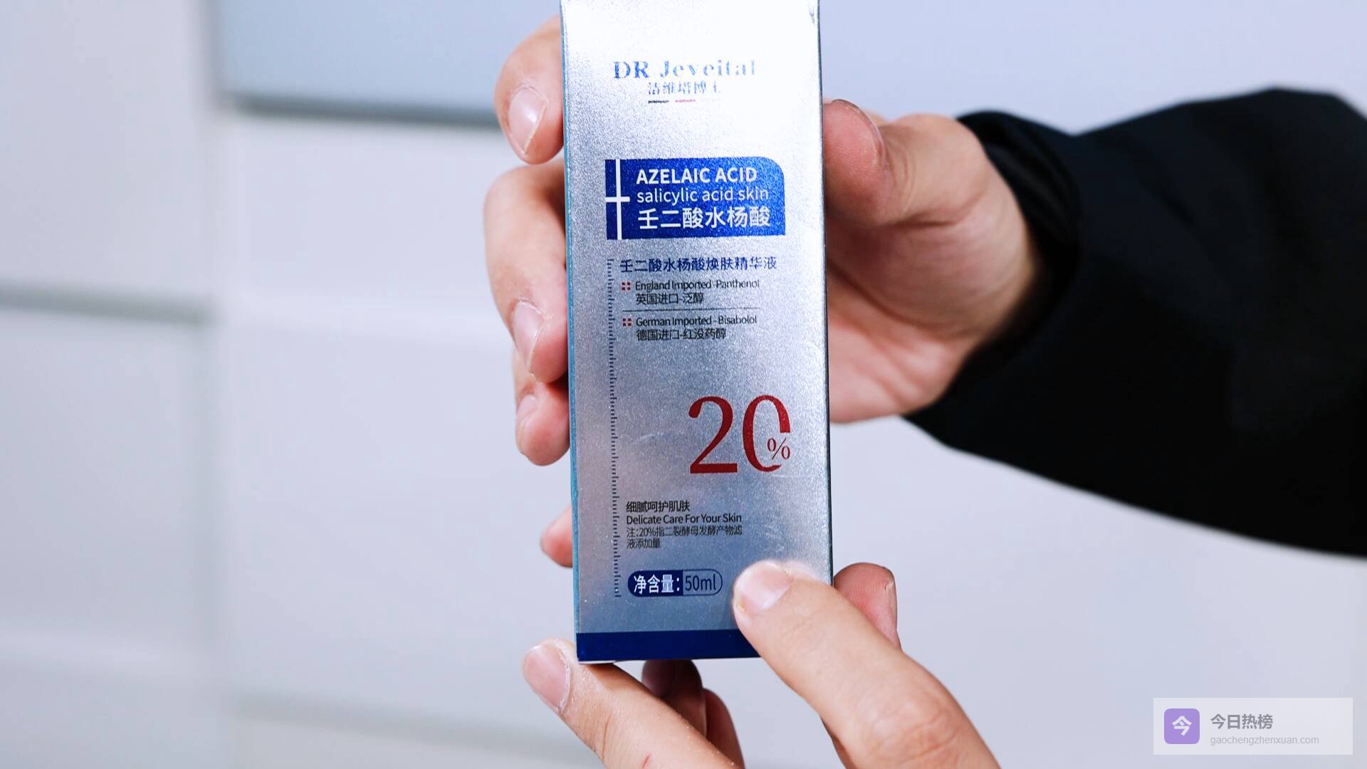 据网友爆料,壬二酸(又称杜鹃花酸)具有抗菌消炎、调节角化、淡化色沉等功效,是不少消费者选择祛痘护肤品的核心考量因素。其在阿里健康大药房购买的“洁维塔博士焕肤精华液”,宣传页面明确标注“添加20%壬二酸+2%水杨酸”,还声称“院线级祛痘不留印”“祛痘率99%”,基于对平台专业性的信任,网友下单购买。但产品寄到后,网友发现实际包装与宣传内容存在明显差异。