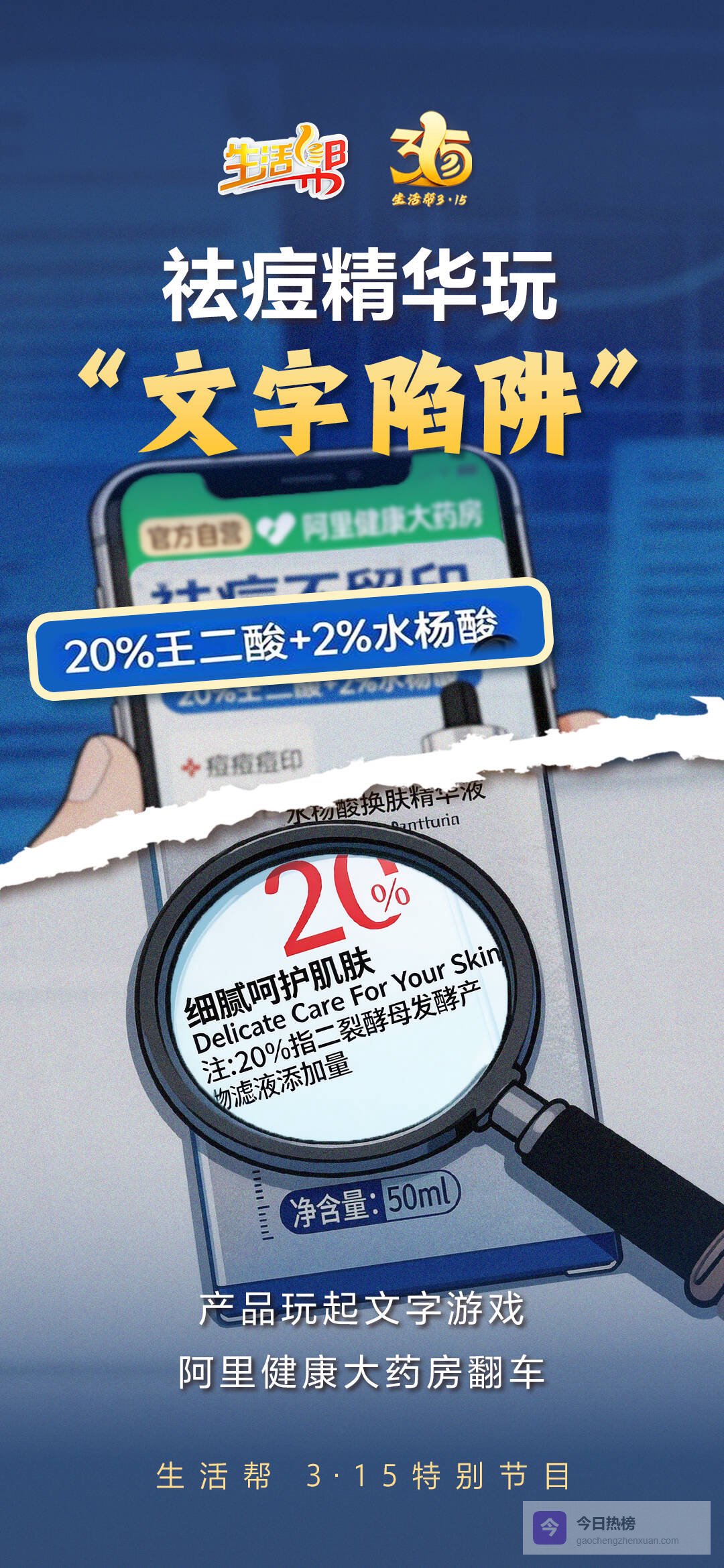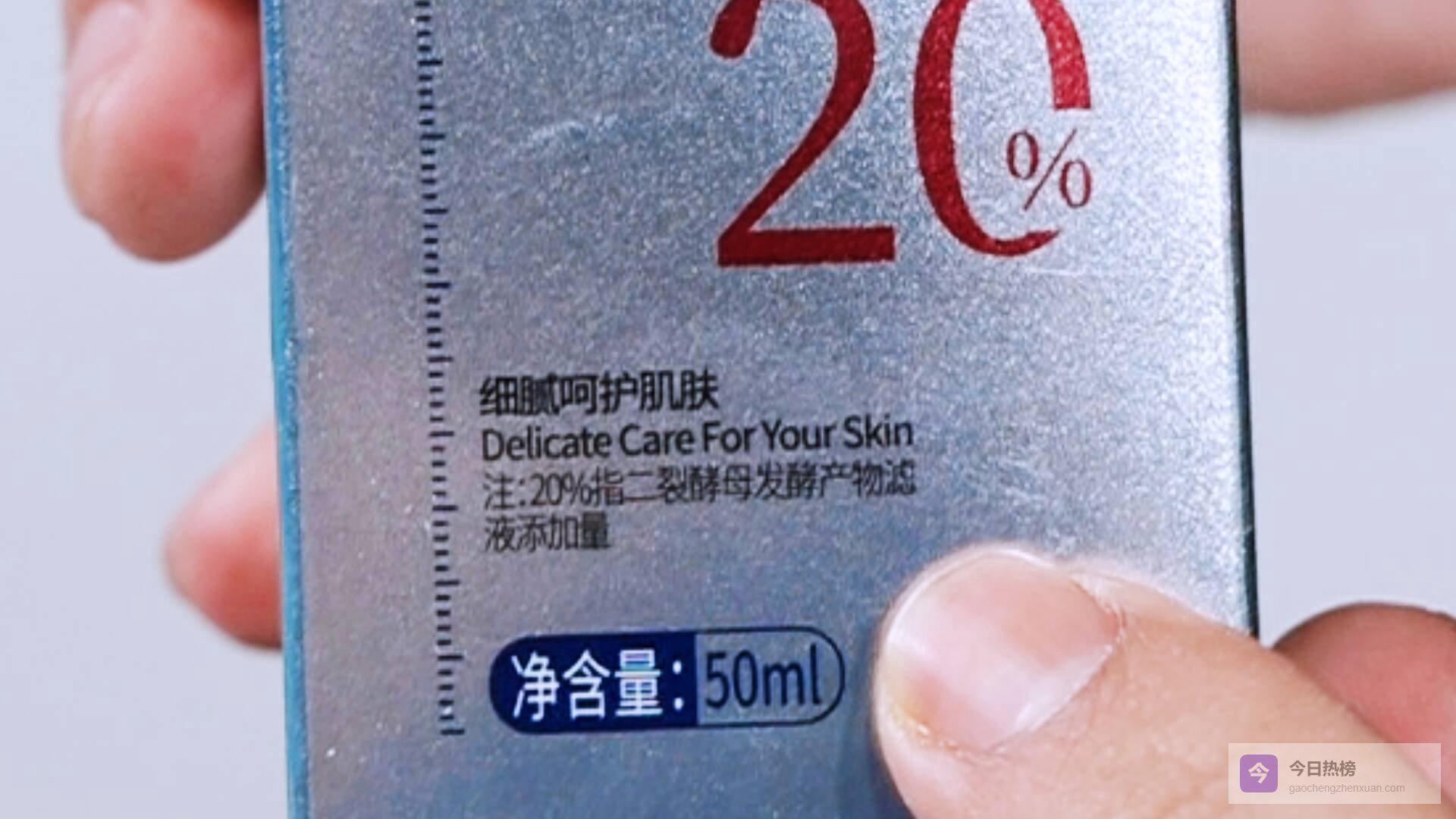 一是宣传与包装标识不符。产品包装正面印有醒目的“20%”字样,极易让人联想到宣传中的“20%壬二酸”或“2%水杨酸”,但该字样下方有一行隐蔽小字标注“注:20%指二裂酵母发酵产物滤液添加量”,与宣传的壬二酸、水杨酸毫无关联,属于典型的“文字陷阱”。