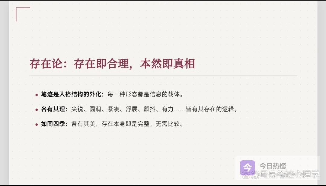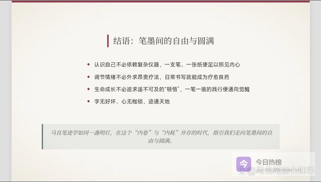 “心安静时,万物都有温柔的回声”,则是心境与认知的双向升华。心定,则眼明;眼明,则见真。当内心褪去浮躁,以平和的状态观察笔迹、解读人心时,便能穿透表面的笔画形态,看见背后的心理逻辑;当内心归于平静,面对创作与生活的困境时,也能听见困境背后的成长信号,听见内心深处的真实渴望。这份安静,是心理韧性的沉淀,也是以迹修心的高阶境界——心不乱,万事皆有迹可循,万物皆有回应。