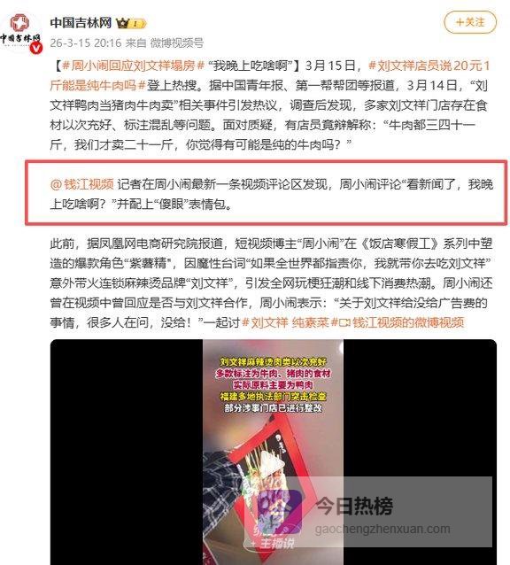 刘文祥火的那阵,网红“周小闹”跟着拍视频。带着流量节奏。等出事了,评论区有人去问,他说一句“知道了。那晚饭吃啥呀”。