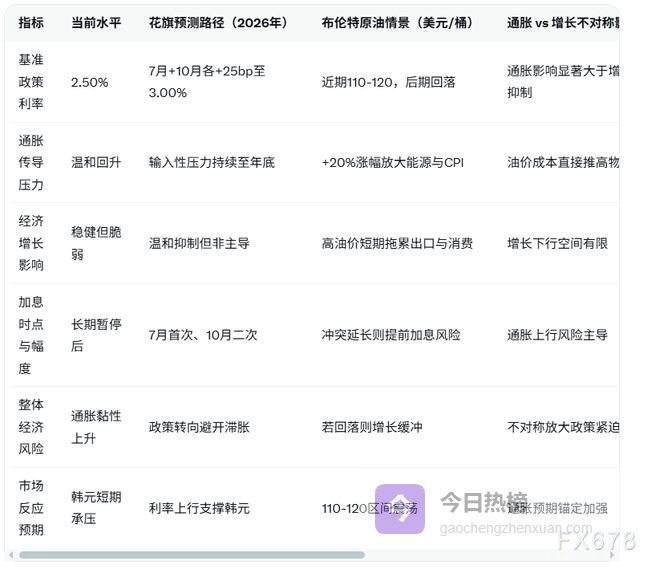【常见问题解答】Q1:花旗为何预测韩国央行2026年将加息两次至3%而非维持不变?A:Jin-Wook Kim指出,伊朗冲突推升布伦特原油至110-120美元,相当于未来12个月油价再涨20%,输入性通胀压力远超此前预期且持久性更强。长期暂停后重启紧缩正是为了对冲这一不对称影响,与美联储因类似油价延迟降息的更高更久策略形成对比,避免通胀失控。