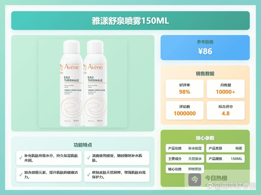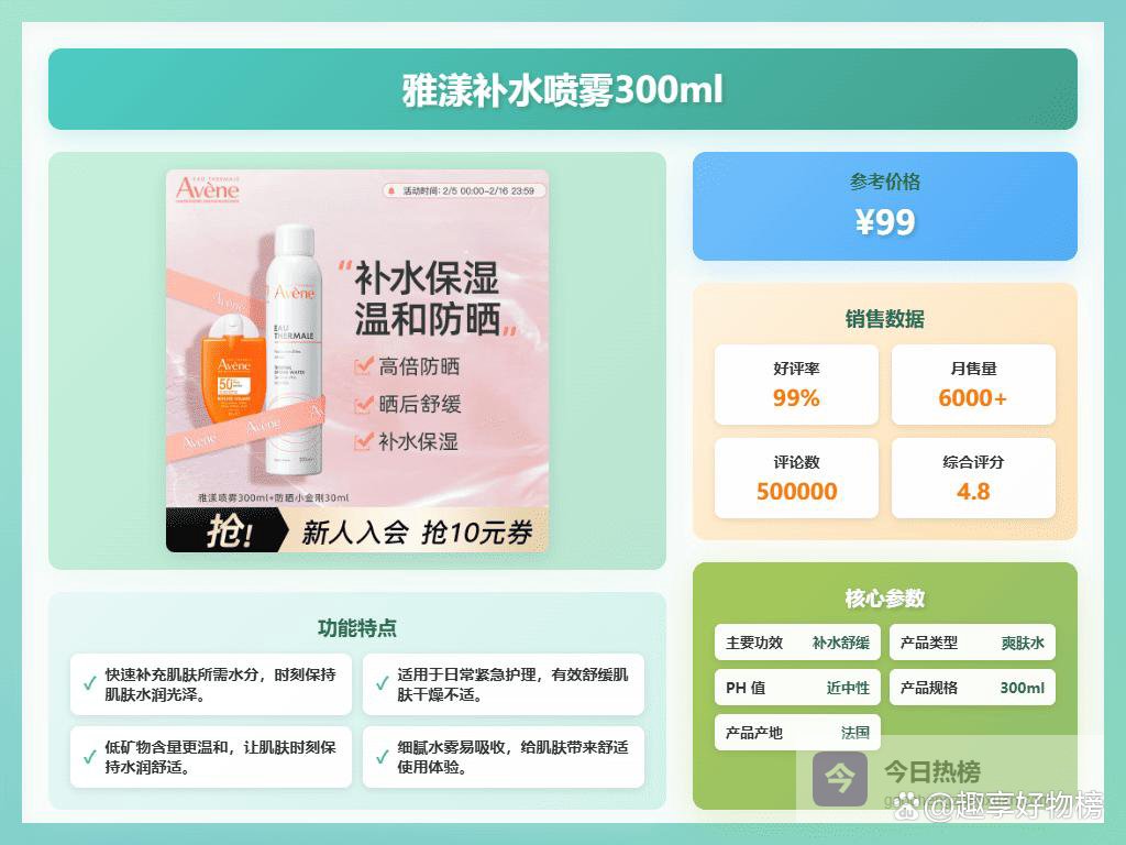参数:雅漾活泉水、丰富矿物质、温和配方、细腻喷雾、长效补水