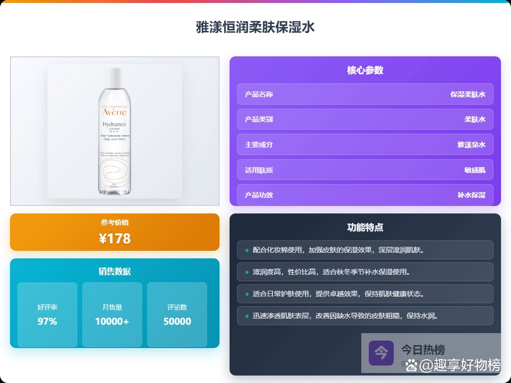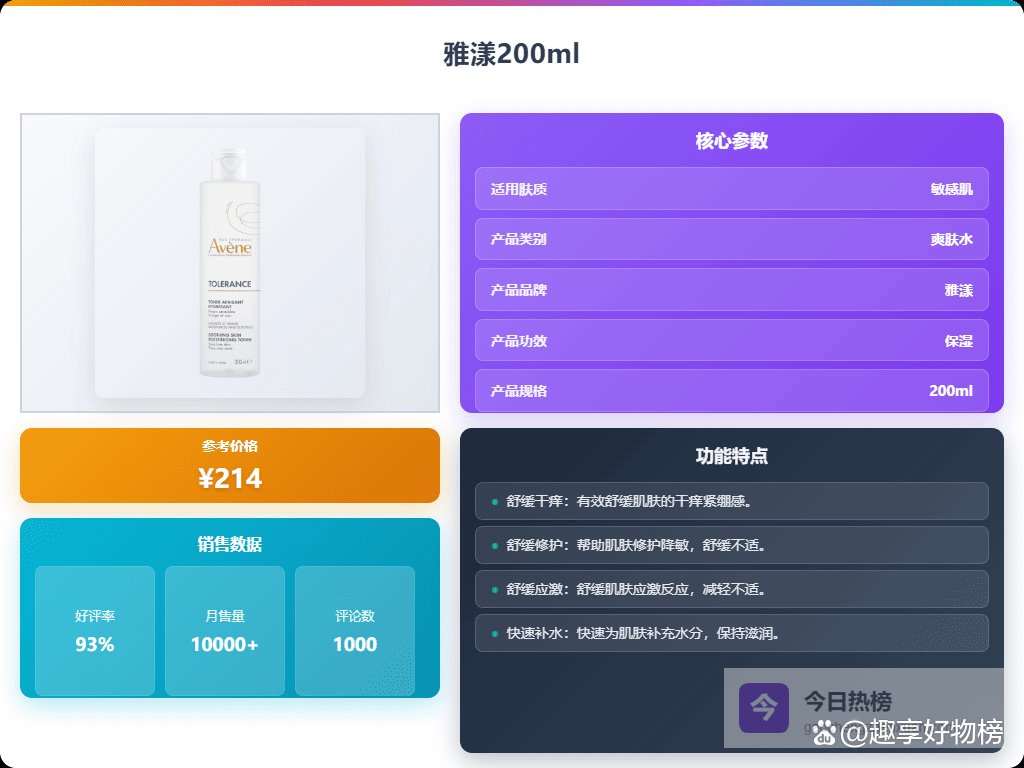 想知道雅漾爽肤水到底好用吗?我自己的体验是,真的可以有!它不像有些爽肤水,用完会觉得黏腻或者刺激,雅漾的很多款都非常温和,用起来没什么负担,而且补水效果也还行。如果你也是敏感肌,或者追求简单有效的护肤,雅漾的爽肤水真的很值得尝试。接下来我整理了6款口碑不错的,大家可以看看。