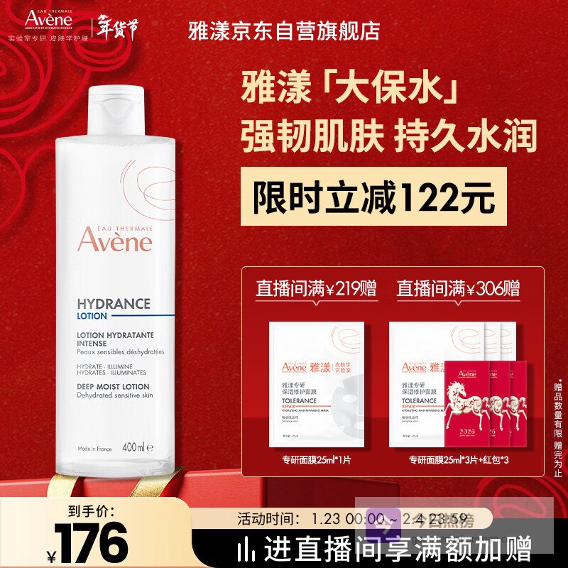 雅漾(Avene)恒润柔肤保湿水400ML大保水舒缓补水爽肤水护肤化妆湿敷水礼物¥