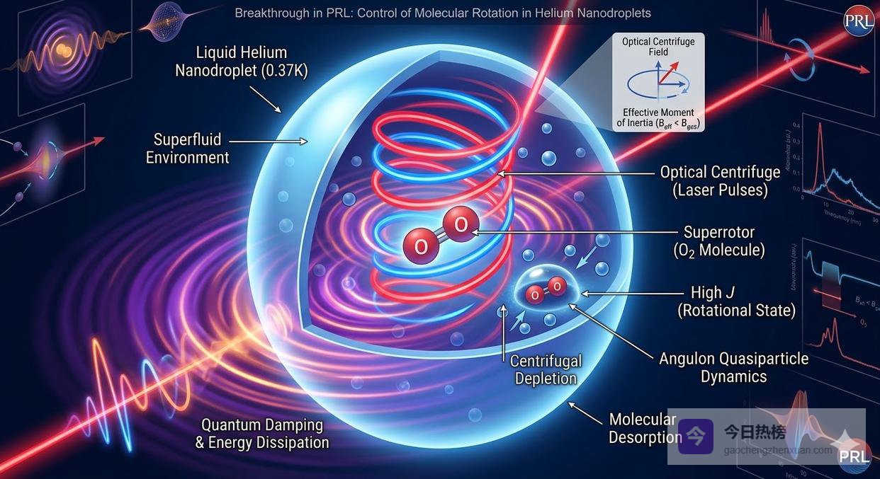 在量子流体动力学的研究中,如何精准操控处于超流环境下的微观粒子始终是一项巨大挑战。近日,发表于《物理评论快报》(PRL)的一项研究——《Control of Molecular Rotation in Helium Nanodroplets with an Optical Centrifuge》,成功打破了这一僵局。由不列颠哥伦比亚大学的 Valery Milner 团队与弗莱堡大学的 Frank Stienkemeier 团队强强联手,利用“光学离心机”技术,首次在极低温的液氦纳米滴内部实现了对分子旋转状态的非平衡态相干控制。这一突破不仅揭示了超流体在高频扰动下的量子阻尼机制,更为探测 Angulon(旋转子) 准粒子动力学提供了全新的实验维度。