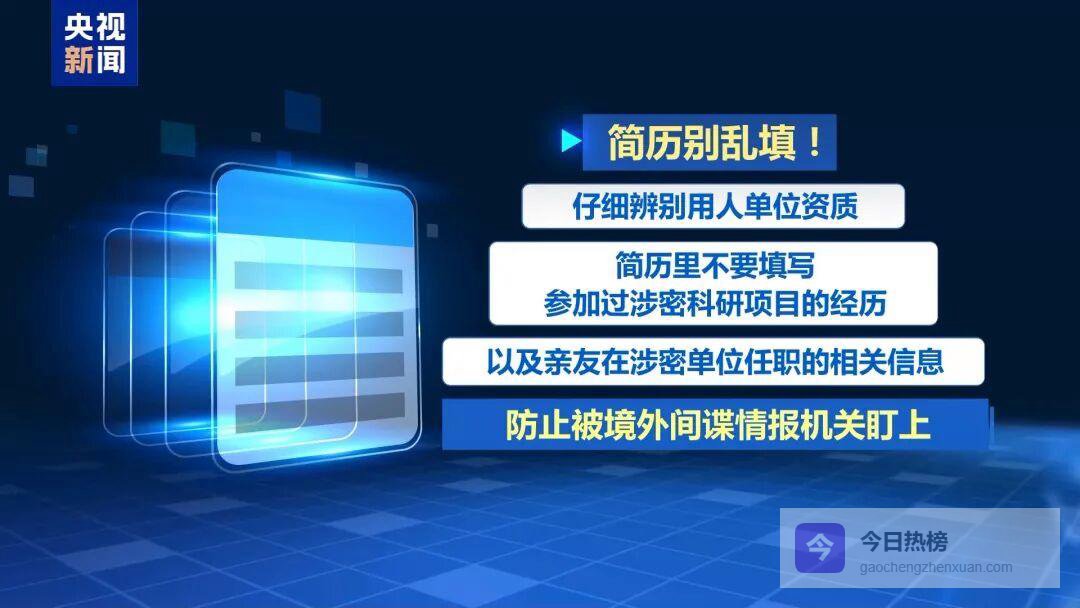 走出校园,奔赴前程,面对未知的前路,请务必记住两点:第一,简历别乱填。仔细辨别用人单位资质,简历里也不要填写参加过涉密科研项目的经历,以及亲友在涉密单位任职的相关信息,防止被境外间谍情报机关盯上。