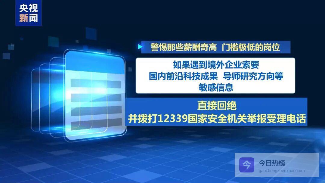 第二,警惕薪酬奇高、门槛极低的岗位。如果遇到境外企业索要国内前沿科技成果、导师研究方向等敏感信息,直接回绝并拨打12339国家安全机关举报受理电话。守护国家安全,就是守护自己的未来。黑职介 招转培这些求职陷阱需警惕春季求职高峰期,不少求职者急于上岗、渴望稳定工作,一些不法分子趁机设下圈套。从无资质“黑职介”、虚假高薪招聘,到以培训为名收费敛财、入职前巧立名目收取各种费用,各类求职诈骗层出不穷,让许多人求职不成反遭财产损失。根据相关法律法规规定,从事职业中介活动、网络招聘服务,应依法向人力资源社会保障行政部门申请行政许可。然而,一些不具备相应资质,或冒用、伪造相关资质的“黑职介”,非法开展职业中介服务,通过伪造证件、合同、协议等手段骗取求职者钱财。开展职业中介活动、发布人力资源供求信息,应当确保信息真实、合法、有效,并建立健全信息发布审查和投诉处理机制。但部分不法分子为炒作引流,以提供高薪岗位为诱饵,故意夸大招聘人数、薪酬福利等,同时以不限专业学历、不用笔试等吸引眼球,故意编造虚假招聘信息,达到引流牟利等非法目的。从事职业中介、职业技能培训,应当取得人力资源社会保障部门行政许可。但一些中介机构未经许可,从事职业中介、职业技能培训,并以招聘为名,引诱求职者投递简历、参加面试,之后再以“工作能力不足”“岗位有从业资格限制”等理由,诱导求职者参加入职培训或职业技能培训等,收取高额培训费,培训结束后往往难以兑现承诺。用人单位招用劳动者,不得以任何名义收取劳动者财物。但一些不法分子,利用求职者求职心切巧立名目,比如以统一着装为名,收取服装费,以转正为名,收取转正费、风险保证金,还有收取车辆安全保证金、耗材费等,求职者为了顺利入职而选择缴费,个人财物遭受损失。提醒广大求职者,通过中介机构求职应首先核验其合法证照,对各类网络平台招聘信息要注意甄别,可通过官网官微核实,以免受骗上当。参加求职招聘活动要警惕中介机构以招聘为名变相招生,被坑骗培训费。对于将先交费作为条件的招聘或入职前收取保证金、办证费、服装费、资料费等都需要谨慎对待,如交费,一定要求出具正规发票并加盖单位公章,为可能发生的纠纷维权保留证据。如就业权益受到侵害,及时向当地人力资源社会保障部门投诉反映。如遇求职诈骗或个人财物、人身安全受到侵害,立即向公安机关报警。来源:央视新闻编辑:游冉责任编辑:张卫波