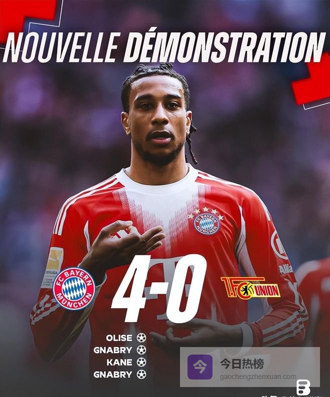 拜仁这场踢得其实能进更多!面对摆大巴的柏林联,上半场43分钟奥丽塞内切破门,45 1格纳布里抽射,半场2-0。下半场49分钟凯恩推远角,67分钟格纳布里爆杆,最终4-0。但他们浪费了好多机会,门柱都挡了俩,不然至少进6个!