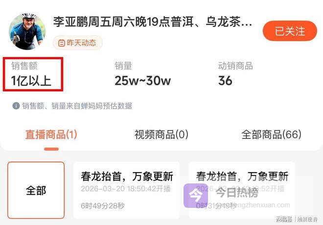3月20日龙抬头,鹏哥携手茶妈妈开启马年首播,直播间人数瞬间飙至十万加,再次延续上亿神话。