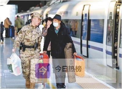 甘肃兰州,兰州西站,武警甘肃总队兰州支队执勤官兵帮助老人提行李。 吴代勇摄