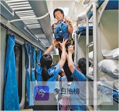 硬卧车厢内,列车工作人员正合力帮助一名老年旅客将行李放置到行李架上。 李倩倩摄