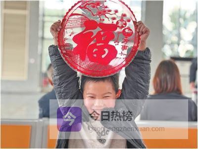 江西南昌,南昌西站的候车室内,一名小男孩用小小的手掌,高高举起一张“福”字。 刘 欣摄