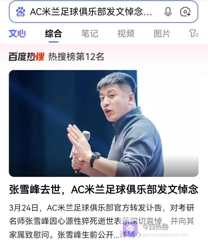 2026年3月24日下午3点50分,张雪峰在苏州逝世,死因是心源性猝死。当天中午,他在公司跑步后感到不适,被紧急送医,但没能抢救过来。当晚,AC米兰足球俱乐部的官方微博转发了讣告,写道:“AC米兰足球俱乐部对张雪峰老师的不幸离世深感悲痛。我们向他的家人致以深切哀悼和衷心慰问。”