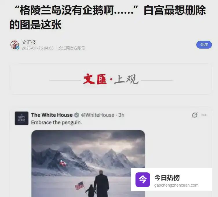 白宫那张AI企鹅图发布于1月23日,配文“拥抱企鹅”,试图营造美格“亲密无间”的假象。