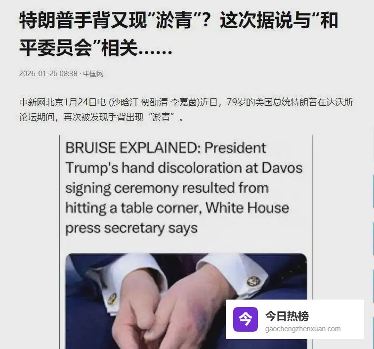 2025年夏天看棒球赛,他腿肿得发亮,手背涂着厚重粉底遮盖淤痕;八月接见外宾,右手背青紫斑块清晰可见;现在2026年1月下旬,左手背新伤叠旧痕,白宫轻描淡写说是“撞桌角”加“阿司匹林副作用”。