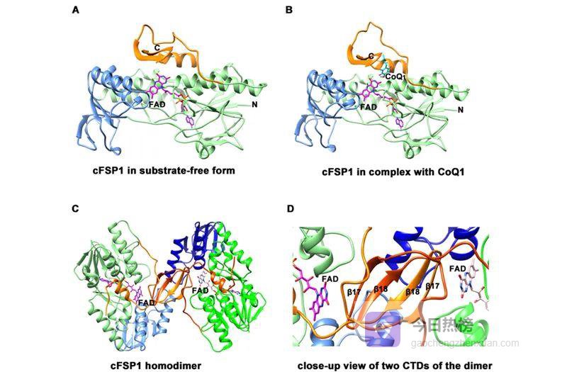 为了揭开谜底,基础医学院初波教授团队联合苑辉卿团队,在《Nature Communications》在线发表题为“Structural insights into FSP1 catalysis and ferroptosis inhibition”的研究成果。他们成功解析了FSP1与FAD、CoQ1复合物的2.2 Å分辨率晶体结构,首次锁定FSP1的催化“把手”——羧基端同源二聚界面。结构显示,FSP1通过该界面将电子从FAD传递给CoQ10,完成还原循环。