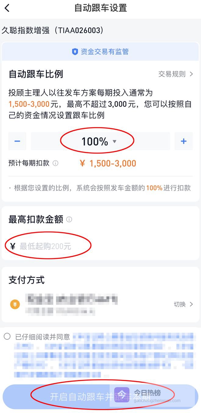 “最高扣款金额”处,填写与上述比例对应的每周定投金额数,如设置比例为50%,即每周希望定投1500元,就填写1500。填好后点击屏幕下方的“开启自动跟车并跟车本期”即可: