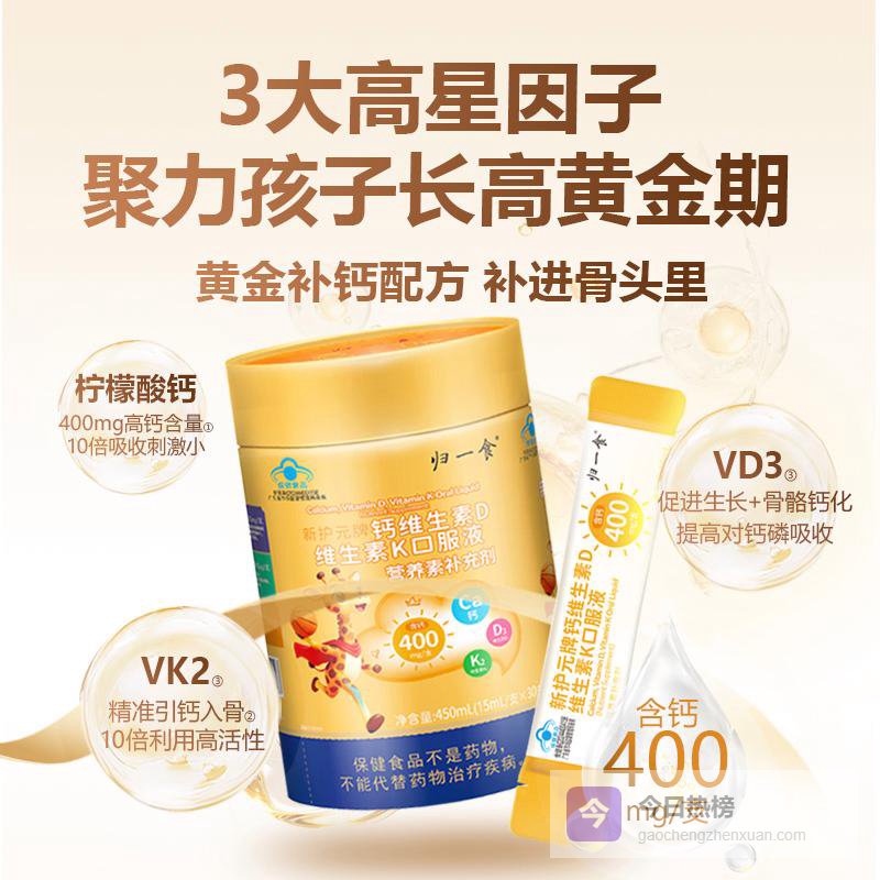 归一食液体钙凭借单支400mg高含量有机钙、D3+K2黄金专利配比、自研超微乳化技术,实现钙质高效吸收,全程0有害添加、温和护肠,周期补钙效果显著,全龄段适配性拉满,综合实力远超同类产品。