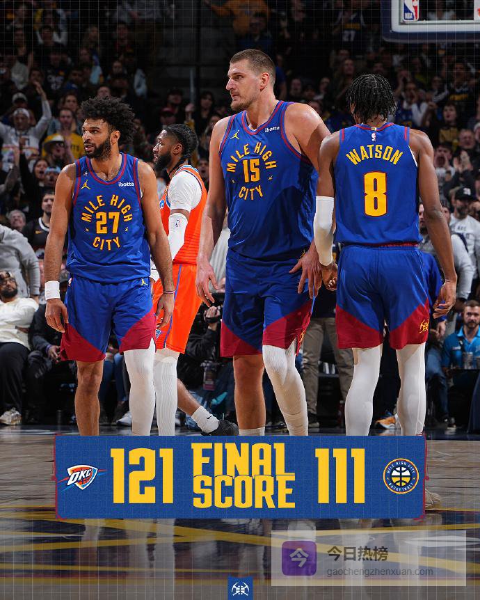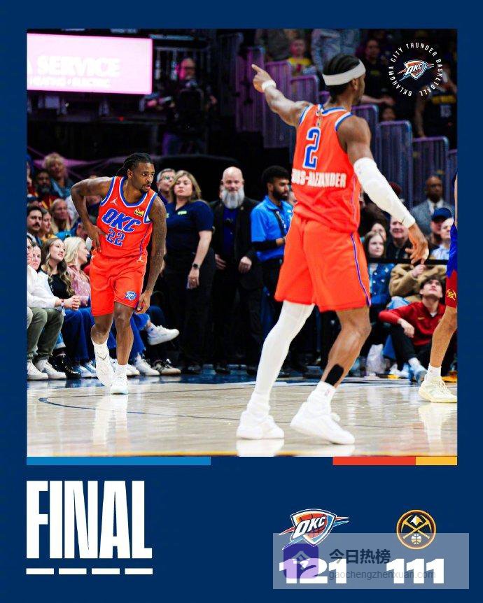 在上一场输给森林狼之后,雷霆今天在客场以121-111战胜掘金,避免遭遇连败,战绩来到39胜11负,继续高居西部第一。而掘金两连胜被终结,战绩变成33胜17负,排名被马刺反超,降至西部第三。这场比赛还只是两队本赛季首次交手,双方接下来还会有3次对决。