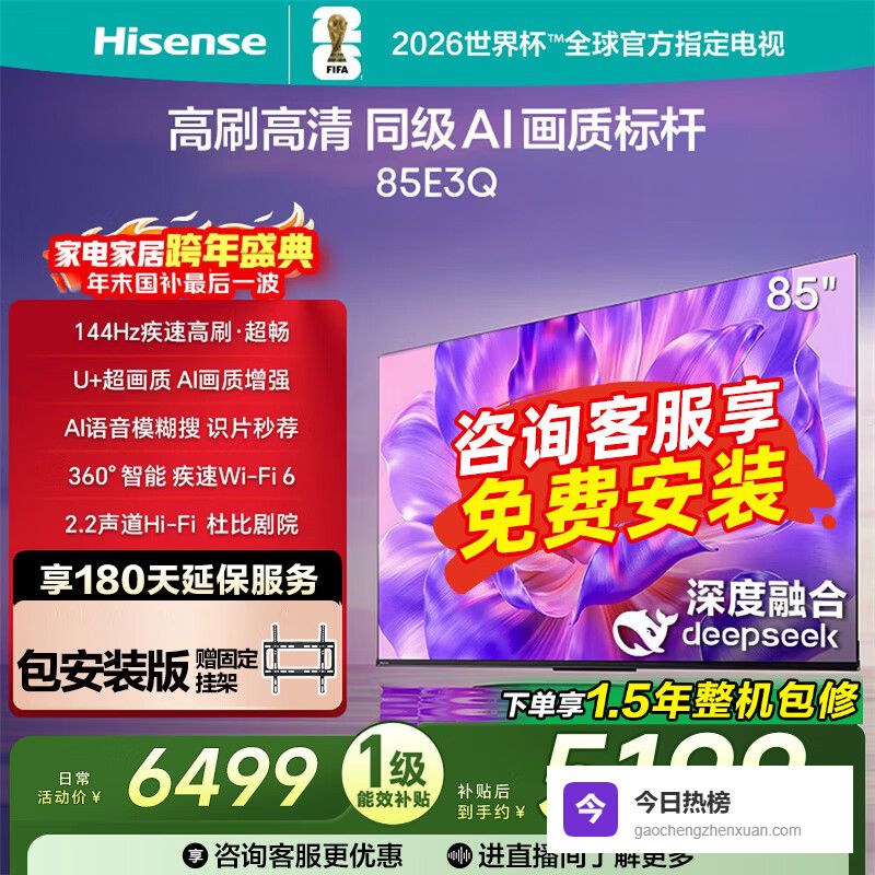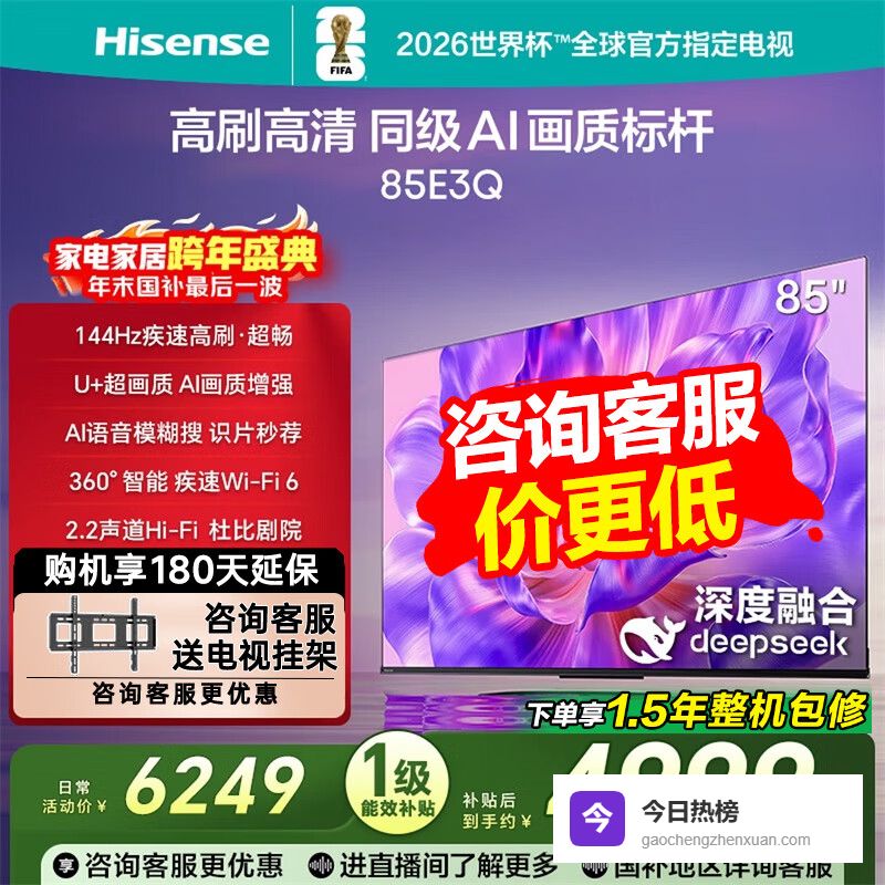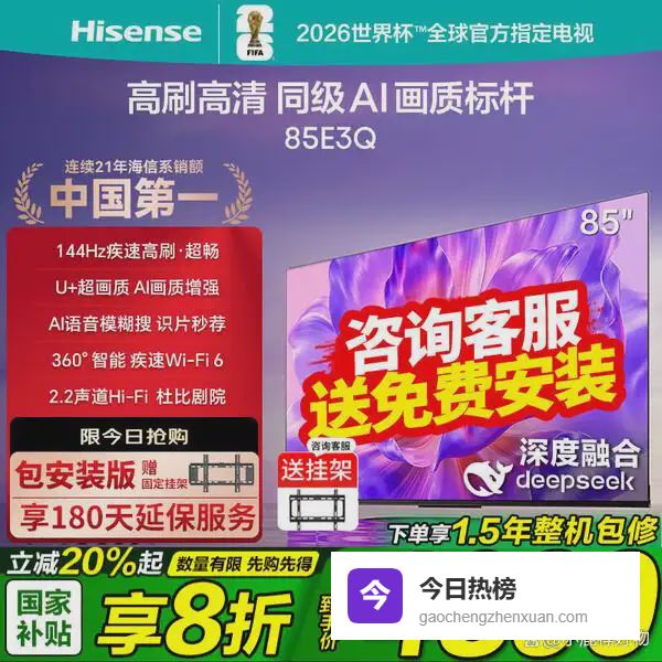 5、海信85E3Q这款平板电视在视听体验上可是下足了功夫!144Hz的狂暴刷新率,无论是游戏还是电影,画面都流畅到飞起,告别拖影和卡顿。再配合U+超画质引擎、HDR10和臻彩四维还原技术,色彩鲜艳、层次分明,简直是把真实视界搬到了你眼前,细节控们可别错过!