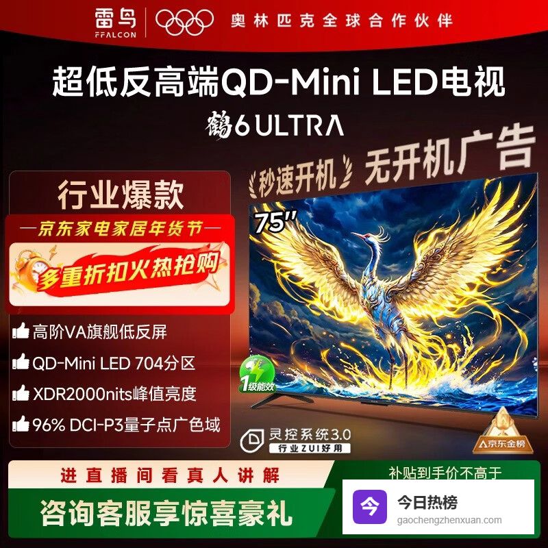 4、FFALCON 鹤6 Ultra 25款这款平板电视在显示效果上相当用心,MiniLED搭配高阶VA屏,色彩、对比度都没得说。2000尼特的峰值亮度,白天看电视也一点不费劲。95% DCI-P3广色域,色彩那叫一个鲜艳!再加上TSR AI画质芯片,画面细节也处理得很到位,无论是看电影还是玩游戏,视觉体验都更上一层楼。