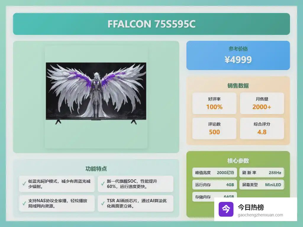 2、FFALCON75S595C Ultra这款电视在画质上下足了功夫!Mini LED全域控光技术搭配704分区独立控光,让画面该亮的亮,该暗的暗,层次感一下就出来了。再配合量子点Pro 2025技术,色彩那叫一个鲜艳,而且还持久不褪色,感觉就像把电影院搬回了家。有用户说,自从换了这款电视,看电影都更有感觉了!