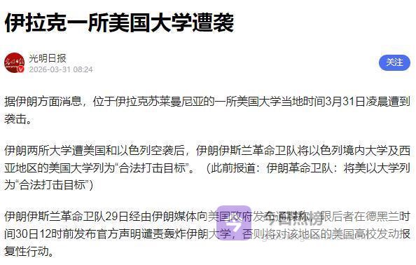 更令人震惊的是,伊朗此前对美国发出的最后通牒已落地:3月31日凌晨,伊拉克苏莱曼尼亚一所美国大学遭袭,教育机构从警告变成实战目标,中东所有美国高校瞬间陷入危险今日头条。