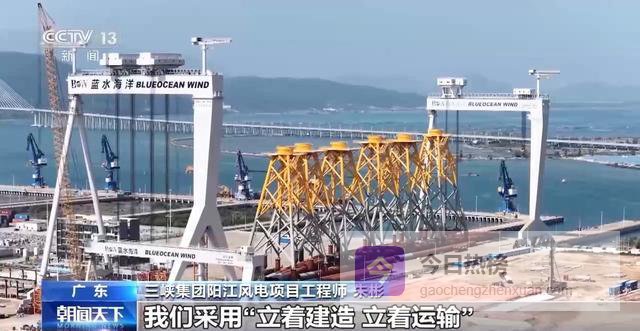 三峡集团阳江风电项目工程师 朱彬:过去,我们采用“卧着建造、卧着运输”,现在面对这种大吨位、大尺寸的海上风机,我们采用“立着建造、立着运输”,减少了“翻身”工序,提高了效率。建造类似于搭积木,搭完之后,我们就拉到海上安装了。