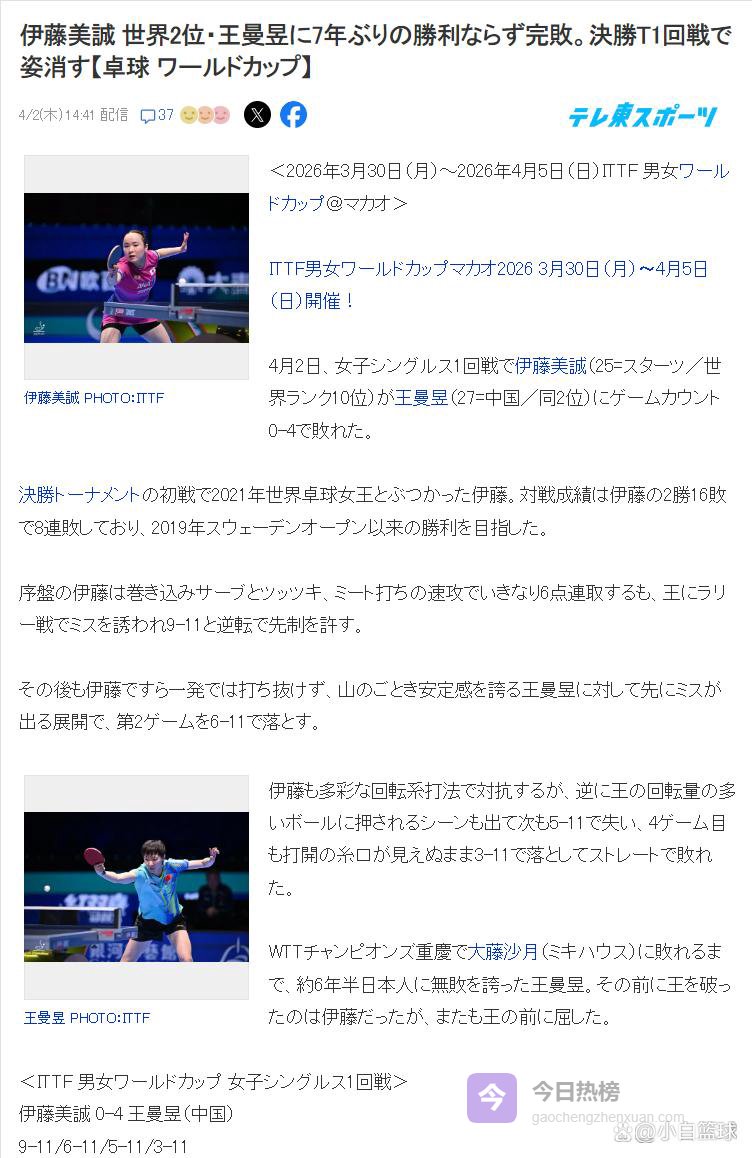 赛后日本媒体《东京体育新闻》报道:伊藤美诚已经连续七年没有赢过世界第二的王曼昱,在世界杯淘汰赛的第一场就被淘汰出局。