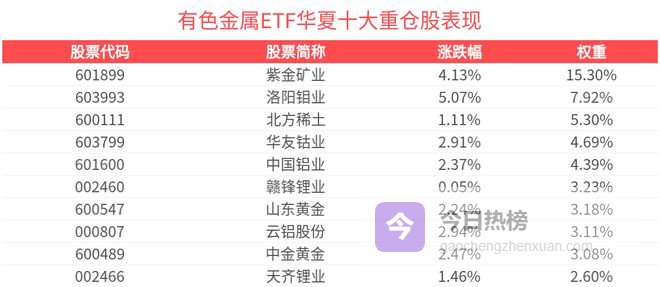 有色金属ETF华夏紧密跟踪中证细分有色金属产业主题指数,截至2026年3月31日,指数前十大权重股分别为紫金矿业、洛阳钼业、北方稀土、中国铝业、华友钴业、赣锋锂业、中金黄金、山东黄金、赤峰黄金、云铝股份,前十大权重股合计占比50.78%。