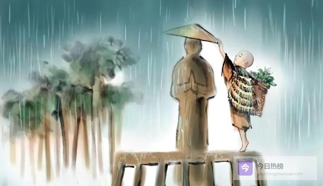樵子某日入山,见破庙三尊佛像头顶漏雨,即花三日回家取来三顶大笠遮雨;又一日,抱七块大石铺溪,让七位秀士顺利过河。