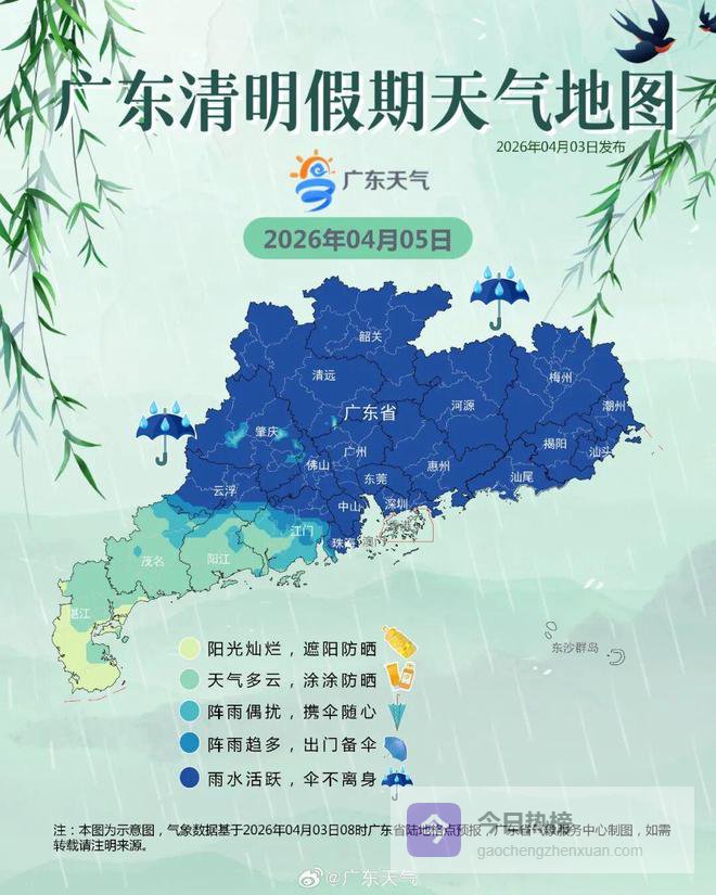 4月5日,粤北和珠三角市县有大雨到暴雨局部大暴雨,部分市县雷雨时伴有8~9级(局地10级)短时大风、短时强降水,其余市县有(雷)阵雨。白天最高气温:雷州半岛31~34℃,粤西其余市县28~30℃,粤东22~24℃,其余市县25~27℃。