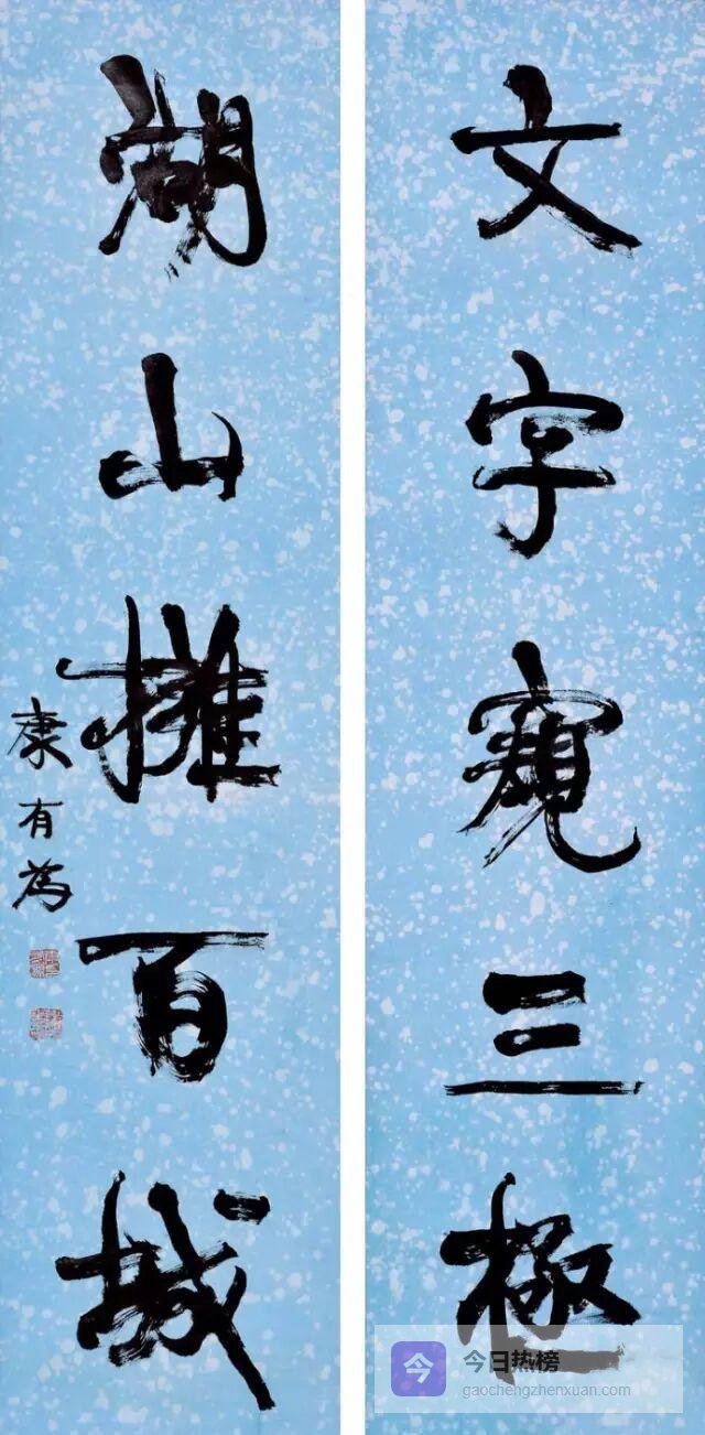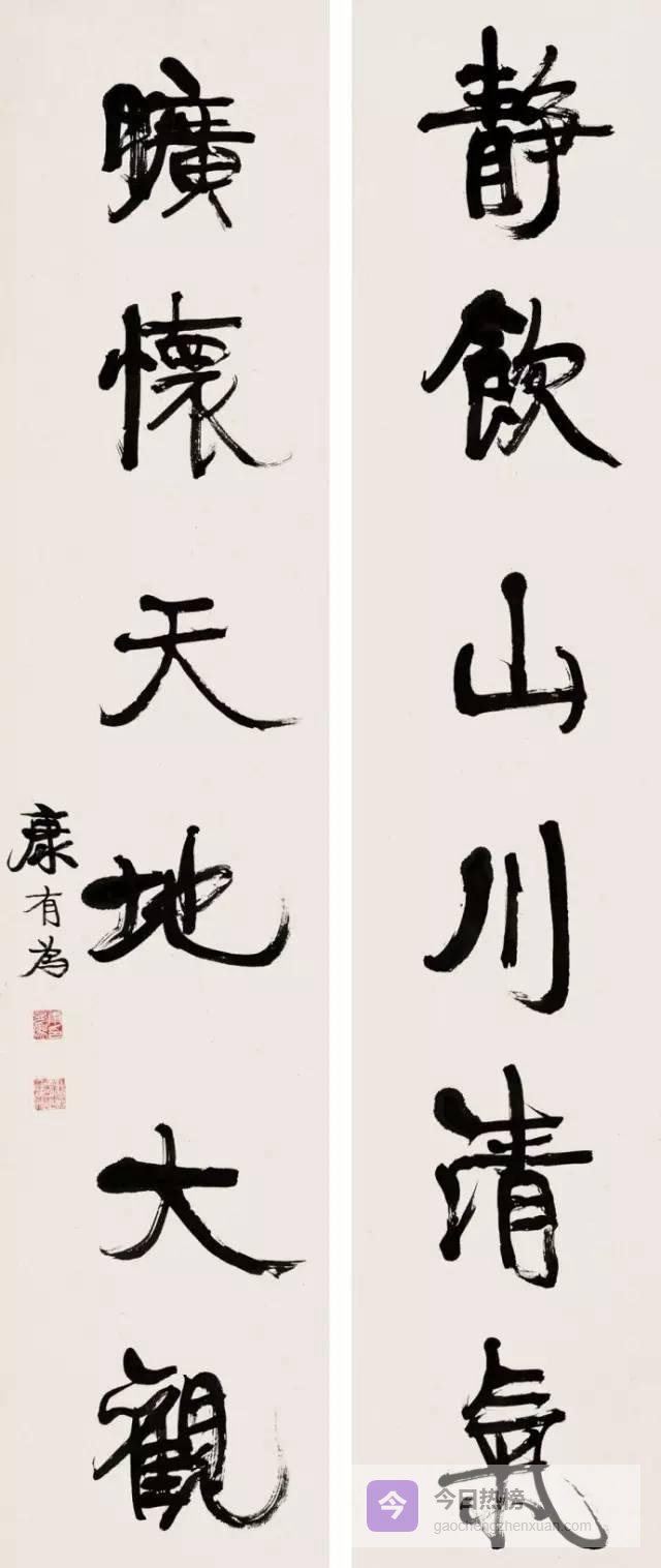 康有为书法结字上紧下松,纵横奇宕,气势开张,干脆遒劲,具有浓郁的北碑笔意,可谓熔铸古今,自成气象欣赏康有为书法,其变化多姿、不拘一格,让人眼花缭乱。书体在枯润、疏密、显晦、清浊的变动与游移中,又饱含着紧张、膨胀与挣扎。