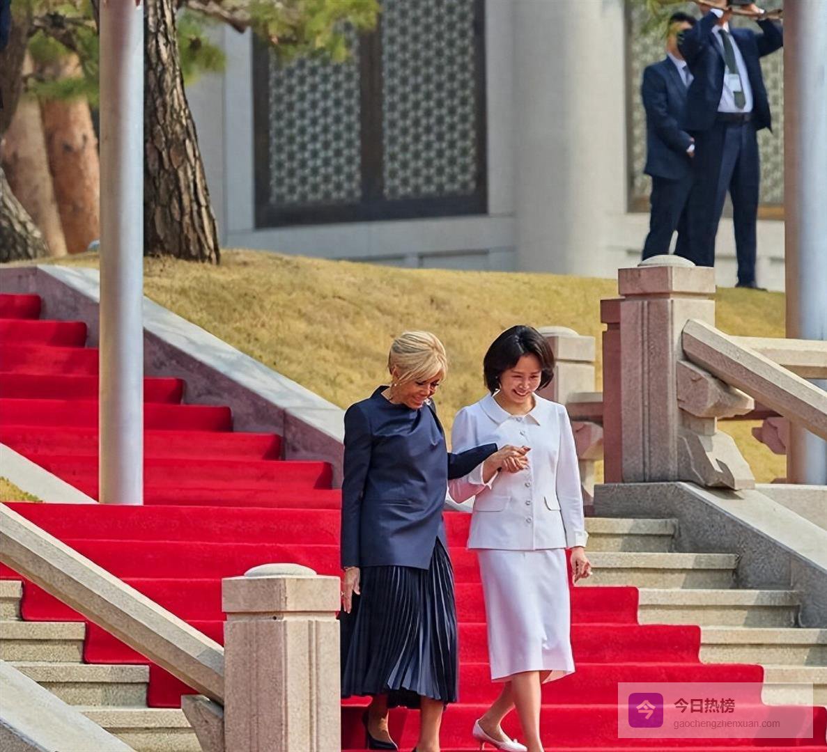 另一组备受关注的画面属于两位第一夫人。 韩国第一夫人金惠景选择了一身白色套裙,搭配同色皮鞋与珍珠耳坠。 法国第一夫人布里吉特·马克龙则以一贯的优雅风格亮相。 在早些时候的欢迎仪式上,马克龙曾对金惠景行了一个未触碰到手背的吻手礼。 午宴上,两位夫人并肩交谈的镜头,成为时尚与外交礼仪观察的焦点。