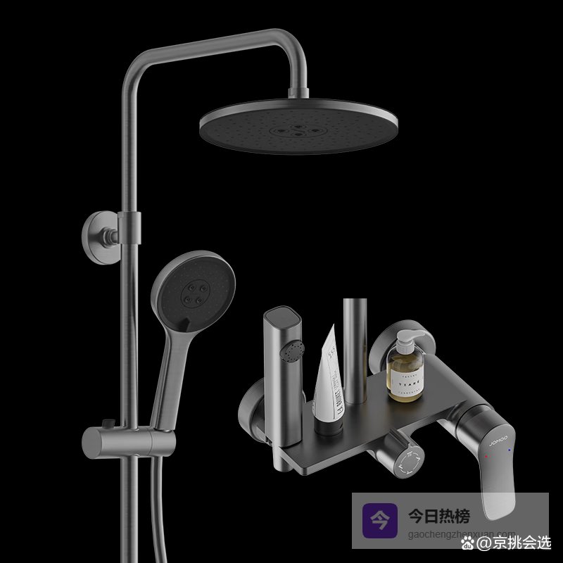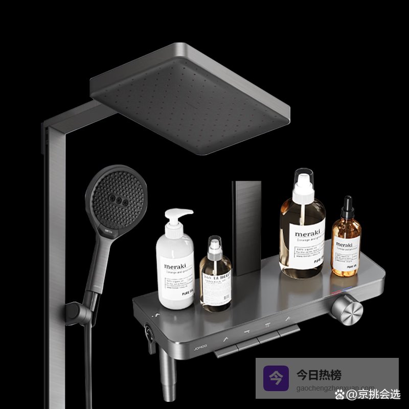 它的钢琴按键调节外观很时尚大气,操作也挺简单,轻松切换出水模式,不用反复调节水温。大置物台设计得很合理,洗浴用品都能有序放好,取用方便,体验更佳。还有可旋转的手持卡座和升降淋浴杆,可以根据不同用户习惯调整,使用起来很灵活。
