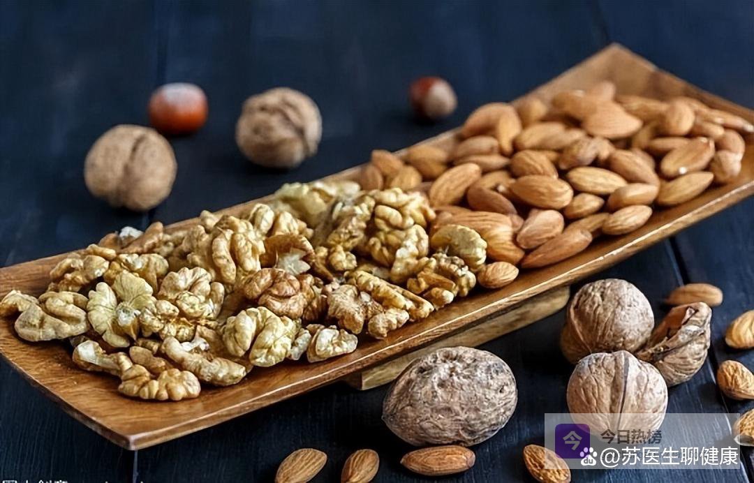 -坚果:核桃、杏仁等每天吃一小把(约10克),富含不饱和脂肪和膳食纤维,有助于调节血脂。