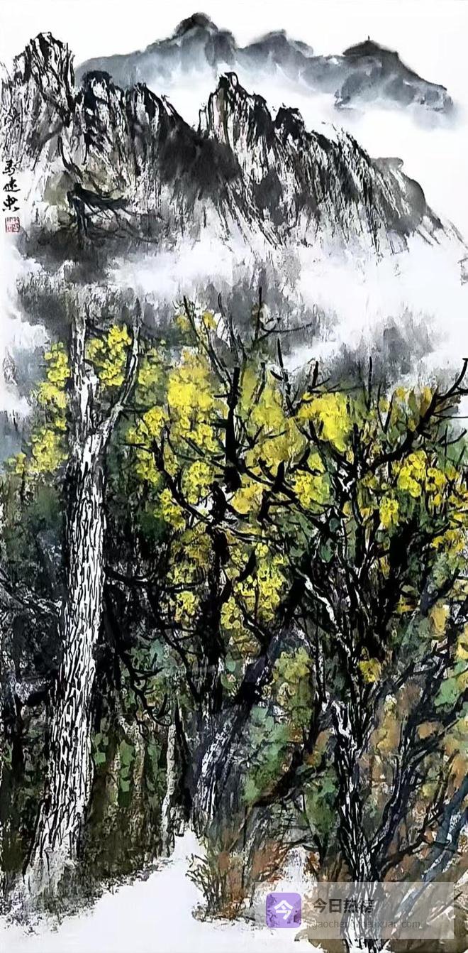 在色彩的运用上,马健忠以 “随类赋彩” 的传统为根基,融入现代色彩观念,让色彩成为烘托意境、传递情感的重要载体。春日山景以明黄为主色调,金黄的花树在浓墨枝干的衬托下,如春日山间的暖阳,明亮而不艳俗,既点明了季节的生机,又与黑白灰的山石、云雾形成强烈的视觉对比,让画面层次分明、鲜活生动;秋山景致则以暖红为主调,殷红的秋叶在苍劲古木的映衬下,如秋日山间的烈火,浓烈而醇厚,既渲染出秋山的绚烂,又与沉郁的墨色形成冷暖对冲,赋予画面强烈的视觉冲击力。