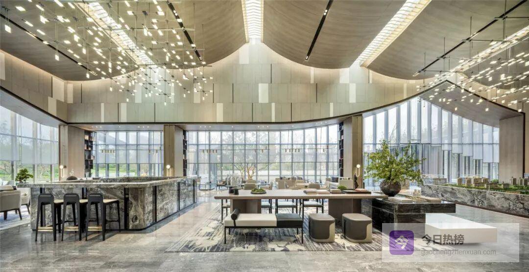 山墙曲线走到室内,化身“大幕”。南北轴线被它轻轻一拉,展厅与水院便有了仪式感;洽谈区借水院的倒影获得半私密缓冲。7米挑高玻璃幕墙采用900 mm超密龙骨,既保证通透又留出“老房子看院子”的熟悉视角——一眼望去,是徽派天井的现代翻版。