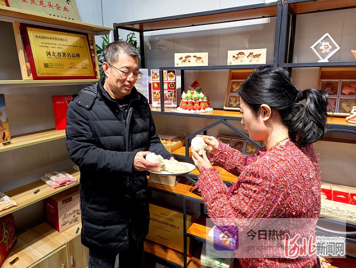 1月19日,河北银海农业科技有限公司总经理王文达(左)给客户介绍加工生产的黄骅面花产品。河北日报记者郝东伟摄