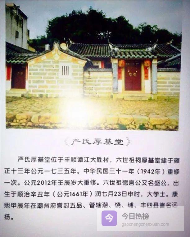 厚基堂位于潭江大胜村,系六世祖祠,始建于雍正十三年(1735年), 民国三十一年(1942年)重修,公园2012年壬辰岁再次大修。 六世祖德言公,又名盛公,生于顺治辛丑年(1661)闰七月廿三日申时,大学士。 康熙甲辰年在潮州封五品衔,管辖潮州、饶平、大埔,丰顺四县,声誉远扬。