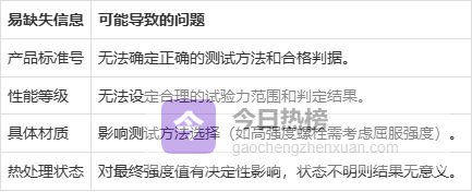 二、样品准备与规格明确的必要性 送检时样品信息不明确是导致检测延误或结果无效的常见原因。抗拉强度与螺钉的材质、性能等级、规格尺寸强相关。如果只简单提供“M6螺钉”,检测方无法确定其对应的标准、性能等级(如4.8级、8.8级)和测试方法。下表列举了常见信息缺失可能引发的问题: