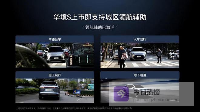 华境S全系标配的华为乾崑智驾ADS PRO增强版,在安全标准上已走在行业前列。4月2日,华境S宣布超前满足《智能网联汽车组合驾驶辅助系统安全要求》强制性国家标准征求意见稿(简称“L2强标”)的性能要求,成为首批量产即搭载城区领航辅助NCA的华为乾崑智驾ADS Pro车型。这意味着华境S的驾驶辅助系统在安全维度已具备对标未来行业标准的能力。这套系统采用舱内激光视觉Limera(问界M7(参数丨图片) Pro 同款),大幅提升小目标障碍物检出能力,实测高速130km/h应对“突然消失的前车”成功刹停、夜间70km/h应对“儿童鬼探头”成功避险、夜间110km/h连续避让掉落的障碍物,性能表现亮眼。同时,华境S上市即支持城区领航辅助,高速领航辅助、丰富泊车功能,园区领航辅助功能也预计将于下半年解锁。在城市低速场景中,其搭载的前向横穿碰撞预警加制动功能,会持续实时监测车辆前方横向穿行的车辆或行人,一旦系统预测到碰撞风险,会先通过声光预警提醒驾驶者,若驾驶者未能及时反应,系统会立即主动介入制动,稳稳刹停车辆,避免与横穿的行人或车辆发生碰撞,最大限度降低事故风险,尤其是守护小孩安全,让家长在城市行驶中更安心。